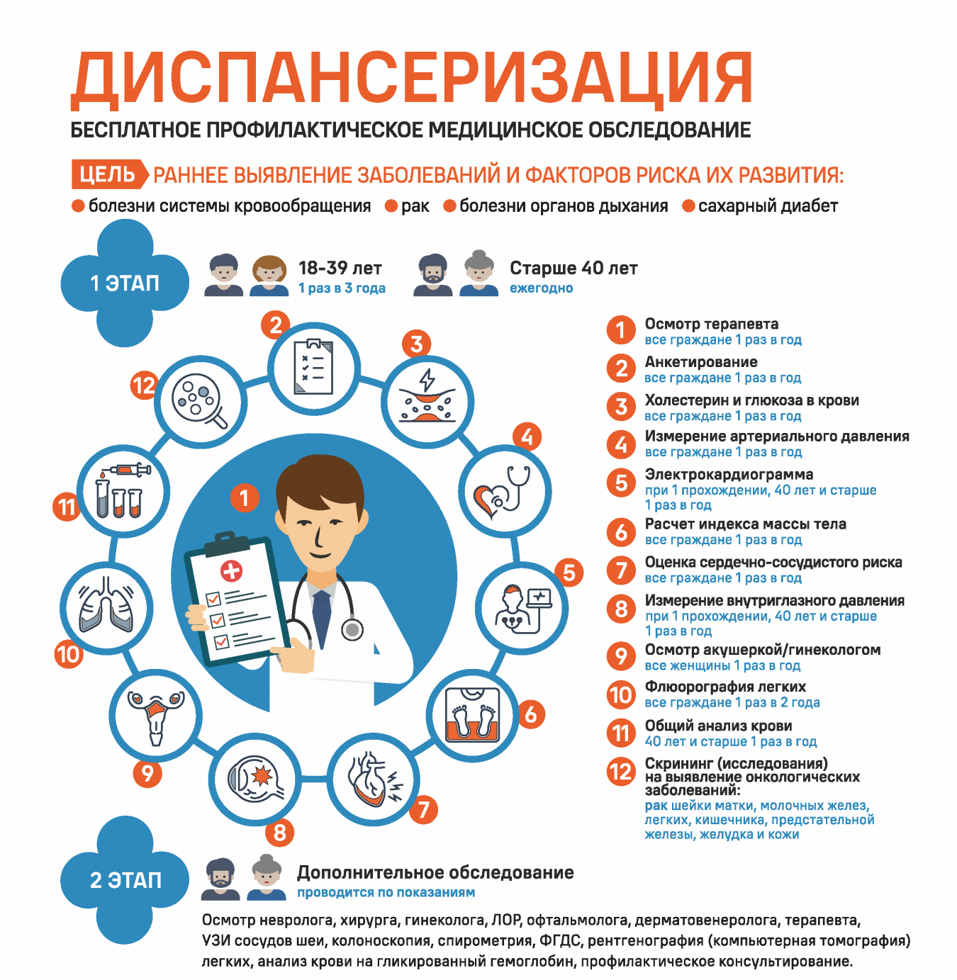 Задача профилактических осмотров и диспансеризации – предотвратить развитие заболеваний или диагностировать их на ранней стадии. Профосмотр – базовый скрининг для раннего выявления патологий или рисков их развития, потребления наркотических средств и психотропных веществ без назначения врача. Диспансеризация – уже расширенный комплекс мероприятий, включающий дополнительные методы исследований, и гражданам 18–39 лет она гарантирована законом один раз в три года, а после 40 лет – ежегодно.