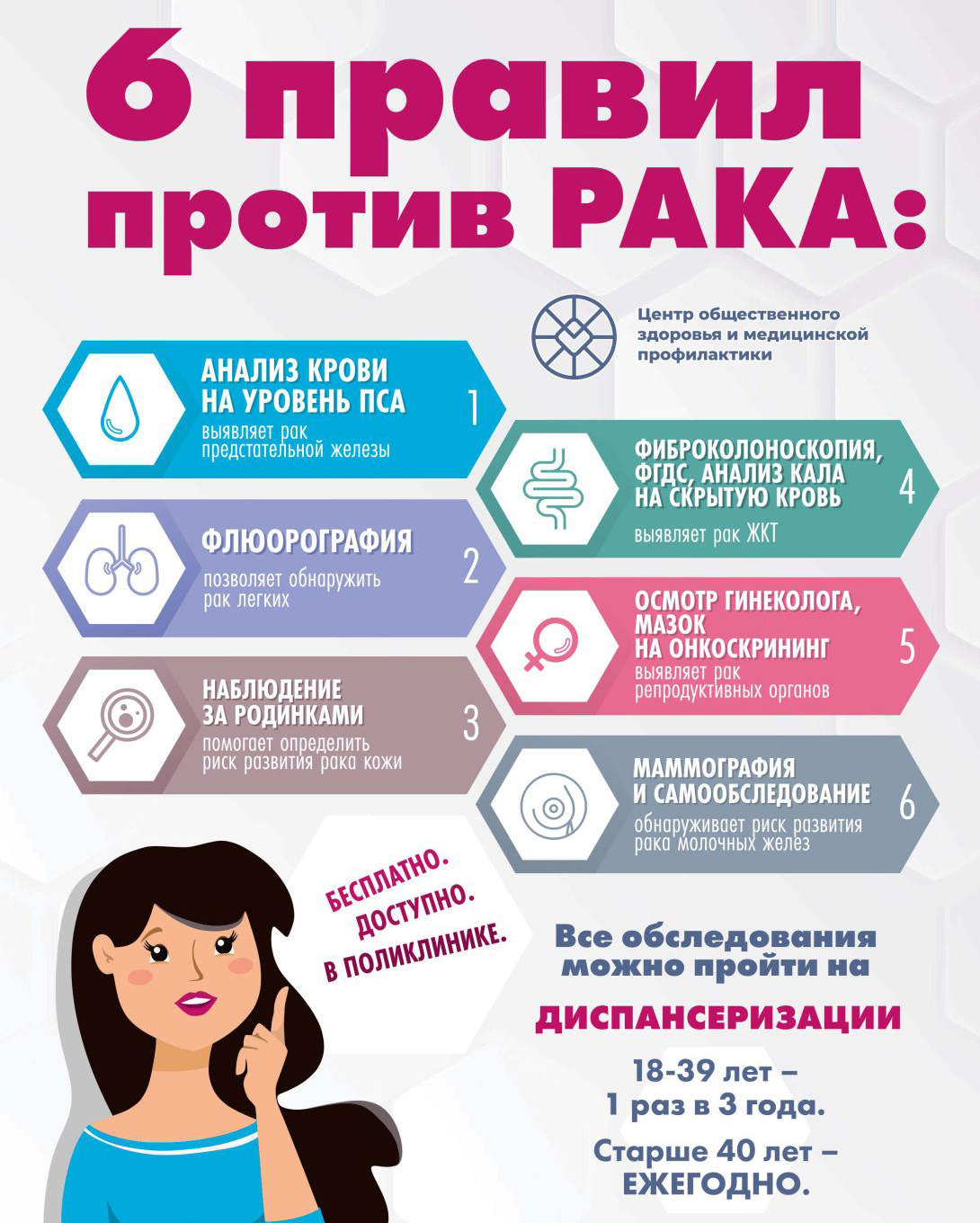Диагностировать онкологические заболевания возможно с помощью регулярных профосмотров и диспансеризации. В возрасте 50 лет и старше необходим регулярный иммунохимический анализ кала на скрытую кровь и/или колоноскопия. Женщинам после 30 лет необходимо ежегодное прохождение скрининга на рак и предраковые поражения шейки матки у гинеколога. В рамках первого этапа диспансеризации мужчинам проводят определение простат-специфического антигена в крови.