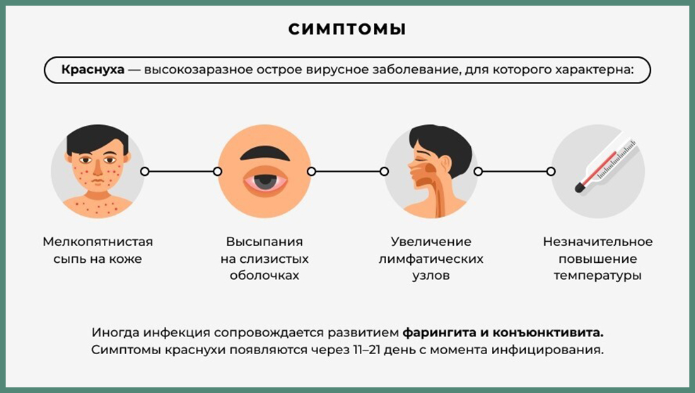 Источником инфекции является человек, больной краснухой. Инфицирование происходит воздушно-капельным путем. Инкубационный период составляет 14-21 день. Больной краснухой опасен для окружающих 7 дней до и 7 дней после появления сыпи.